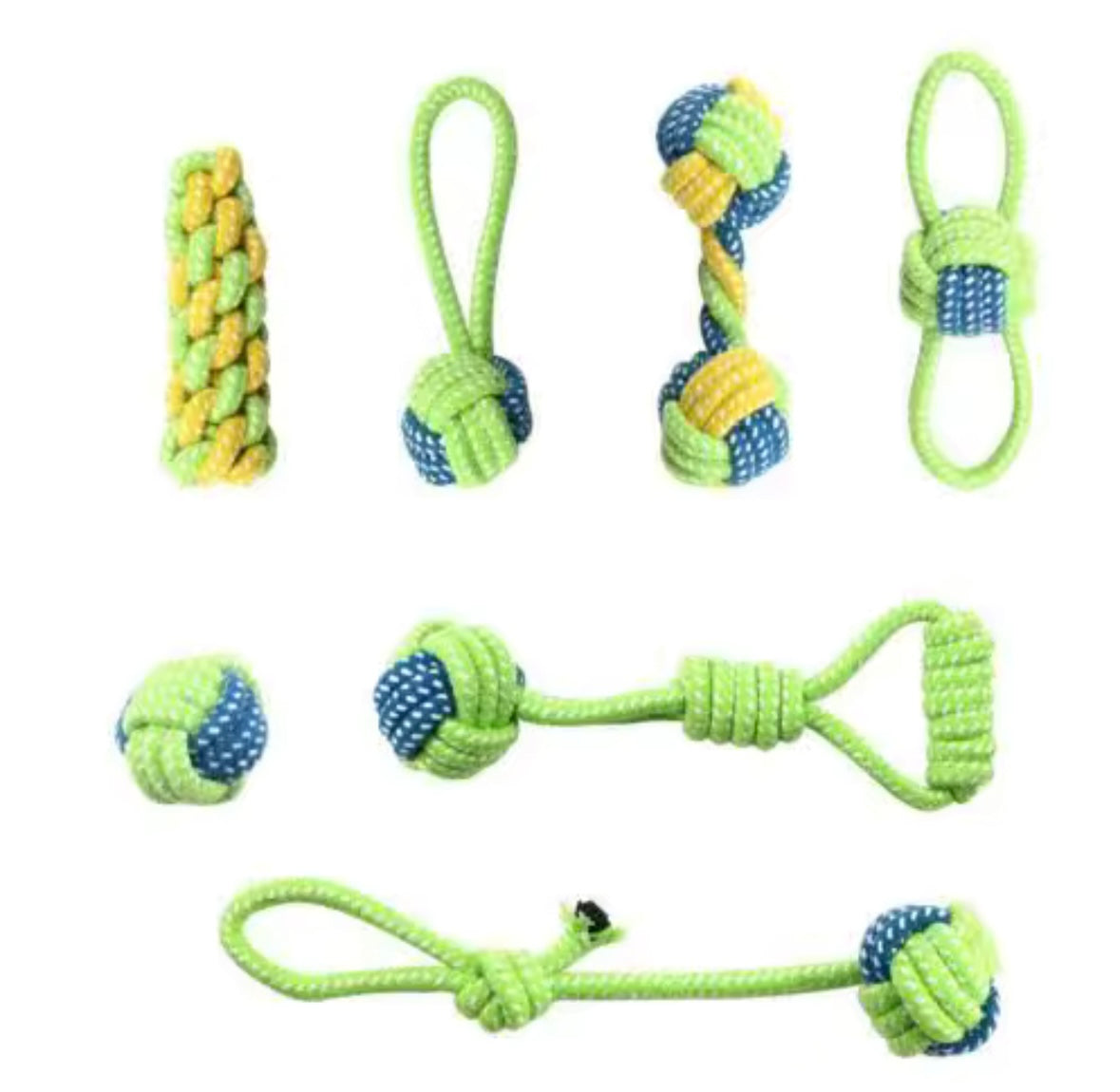 הפכו כל יום של הכלב שלכם לחגיגה של פעילות, גירוי והנאה עם סט מגוון של 7 צעצועי חבל איכותיים! כל צעצוע עשוי כותנה קלועה ועמידה, שמתאימה ללעיסה, למשיכות, למשחקי אינטראקציה או לבילוי עצמאי. הסט מעולה לגורים שנמצאים בשלב של צמיחת שיניים, וגם לכלבים בוגרים שאוהבים לעסוק במשחק פיזי. פתרון מושלם להפגת שעמום ושמירה על בריאות הפה.
